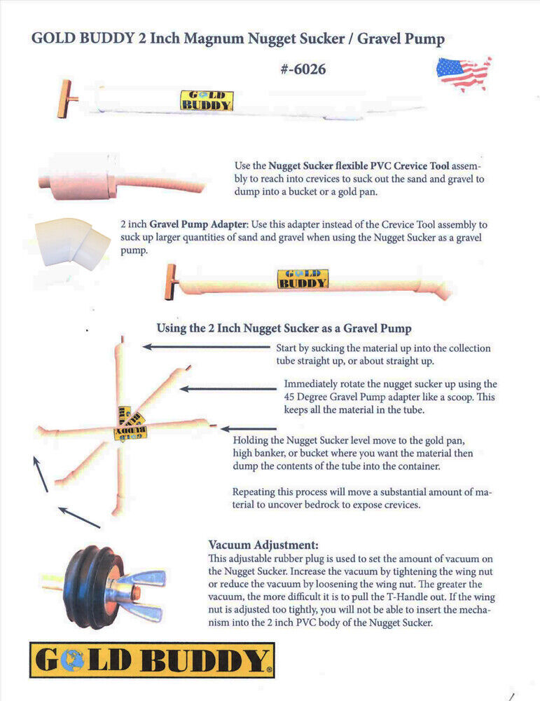 Tubo de 2,5 pulgadas de diámetro. Punta de boquilla de 1 pulgada que tiene aproximadamente 7 pulgadas de largo y punta adaptadora de bomba de martillo intercambiable de 2 pulgadas para aspirar mayores cantidades de arena y grava cuando se usa el Nugget Sucker como bomba de grava.